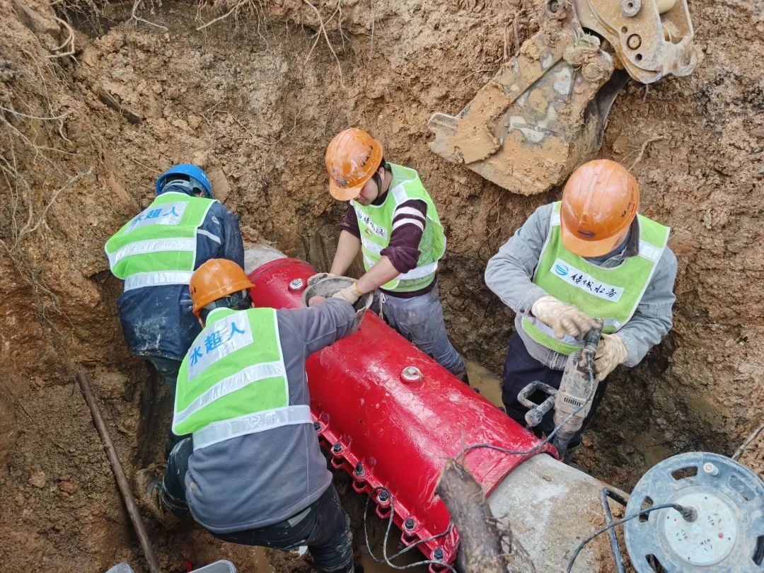 經(jīng)現(xiàn)場(chǎng)勘查,確定是地下一根DN400水泥管突發(fā)爆裂滲水,“水超人”應(yīng)急搶修隊(duì)員立即投入“戰(zhàn)斗”。“春節(jié)期間保供水刻不容緩,我們務(wù)必爭(zhēng)分奪秒,盡快恢復(fù)通水,將停水對(duì)市民的影響降到最低”,搶修班班長徐振峰一邊指揮搶修隊(duì)伍進(jìn)行搶修,一邊緊急安排送水車確保市民應(yīng)急用水。搶修隊(duì)員依據(jù)以往豐富的經(jīng)驗(yàn),在錯(cuò)綜復(fù)雜的地下管線中快速找到漏水點(diǎn)后立即開展管道修復(fù)工作。當(dāng)天陰雨綿綿,現(xiàn)場(chǎng)氣溫降到10℃以下,在水中堅(jiān)持作業(yè)的搶修隊(duì)員們?nèi)頋裢福瑸榱藫寱r(shí)間趕進(jìn)度,隊(duì)員們冒著瑟瑟寒風(fēng),在冰冷的環(huán)境下輪流上陣,從趕赴現(xiàn)場(chǎng)處置到恢復(fù)供水只用了5小時(shí),高質(zhì)高效完成了沙井大道DN400水泥管的搶修任務(wù)。今年春節(jié)期間南寧遭遇的低溫寒潮天氣給管網(wǎng)管理處帶來了不小挑戰(zhàn),據(jù)統(tǒng)計(jì),春節(jié)期間公司共出動(dòng)搶修人員1934人次、搶修車輛312車次,送水車31車次,全力為城市供水命脈暢通保駕護(hù)航。